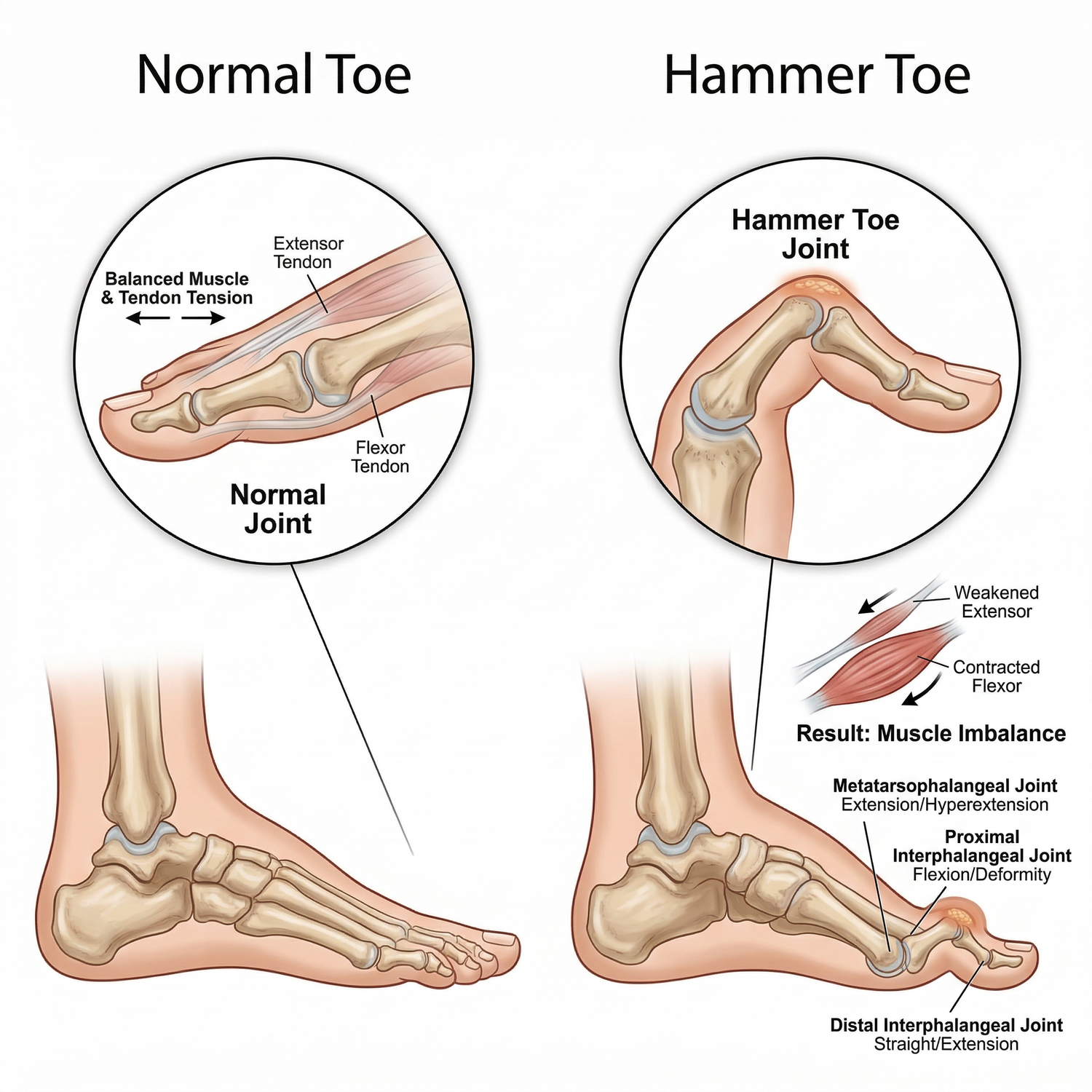 The muscles that should keep your toe in place are weak, causing it to bend and take on a hammer-like shape over time.